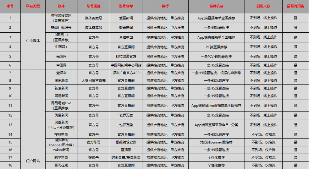 - 權(quán)威媒體平臺(tái):如央視網(wǎng)、新華社現(xiàn)場(chǎng)云、中國(guó)網(wǎng)等,這些平臺(tái)具有較高的權(quán)威性和影響力,適合進(jìn)行重大活動(dòng)或品牌發(fā)布會(huì)的直播分發(fā)。
