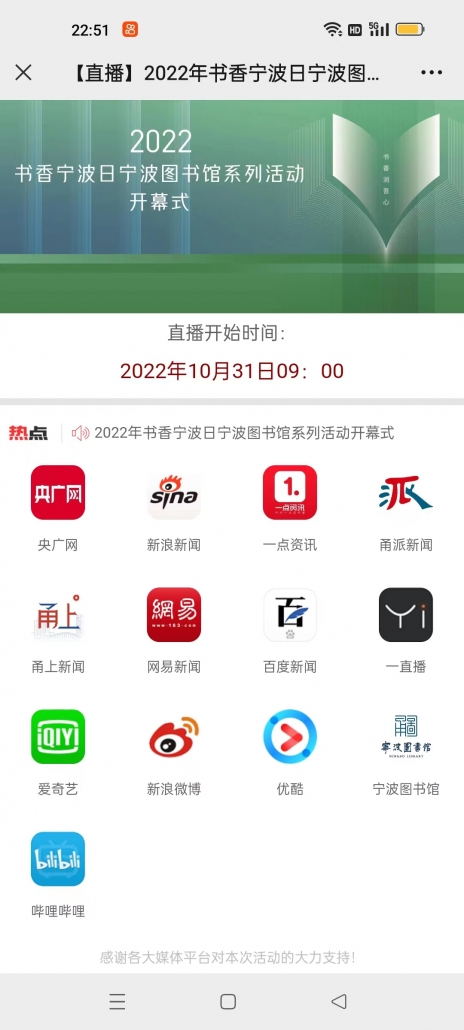 書香寧波日活動,通過線上線下結(jié)合,與主流媒體同步直播的方式,最大化的宣傳了活動,獲得百萬級別觀看量。本次分享案例是2022年書香寧波日寧波圖書館系列活動開幕式活動。